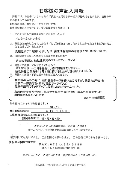 公開してもよい/お客様の声のみなら公開してもよいに印を入れて頂いたお客様のアンケートのみ一部公開しております。