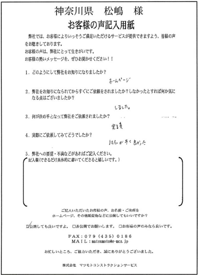 このような状況でもアンケート・お写真のご協力まで頂き、「対応は大変良かった」とのお言葉まで頂き・・・弊社の方こそお客様の懐の大きさに感謝の気持ちでいっぱいです。