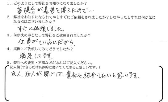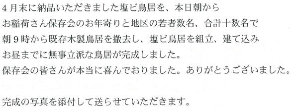 弊社製の鳥居のご購入を決めて頂けたとアンケートを拝見して知りました。